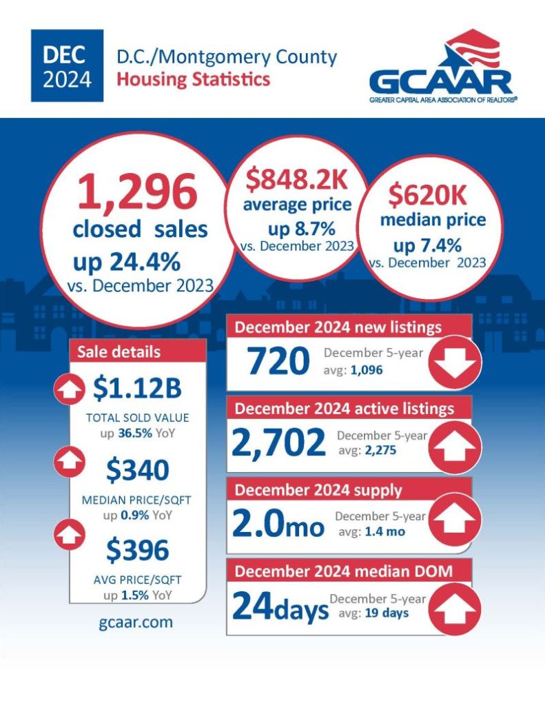 The housing market in Washington, D.C. and Montgomery County ended 2024 on a high note, with substantial growth in sales and prices. With strong buyer demand, rising values, and homes selling quickly, both sellers and buyers should feel optimistic as we head into 2025. It’s clear that the D.C. metro area remains one of the most sought-after real estate markets in the country, and this trend looks set to continue well into the new year.
